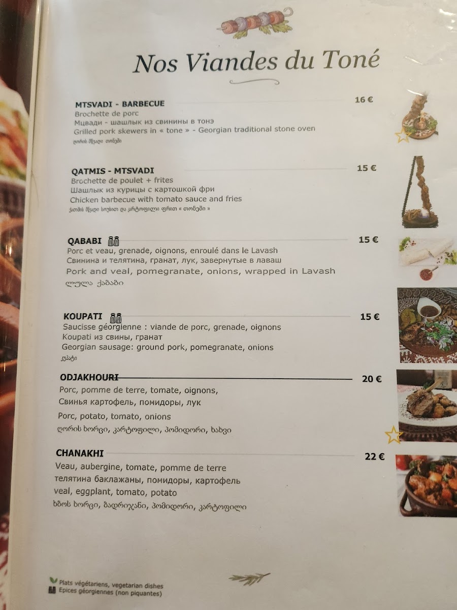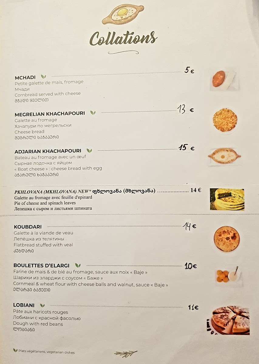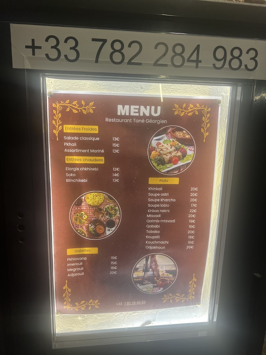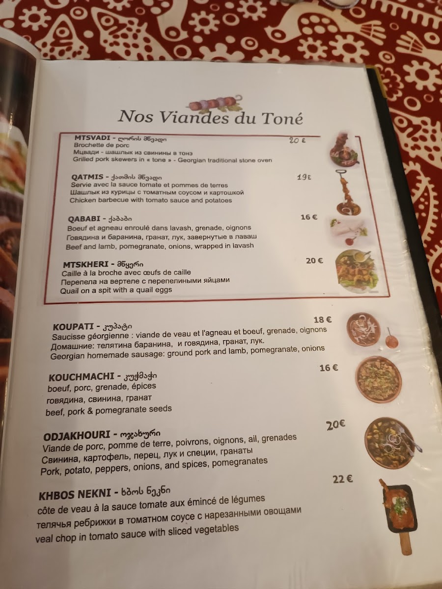 The menu at Restaurant Toné Géorgien offers a selection of traditional Georgian dishes alongside a variety of complementary beverages. The food options include a range of starters, mains, and desserts showcasing characteristic ingredients and cooking styles from Georgian cuisine. Visitors can expect dishes such as Pkhali (vegetable and walnut spreads), Khachapuri (cheese-filled bread), and various meat dishes including Shashlik (grilled pork skewers) and Veal prepared with tomato. Vegetable salads and side dishes like eggplant salad are also available.