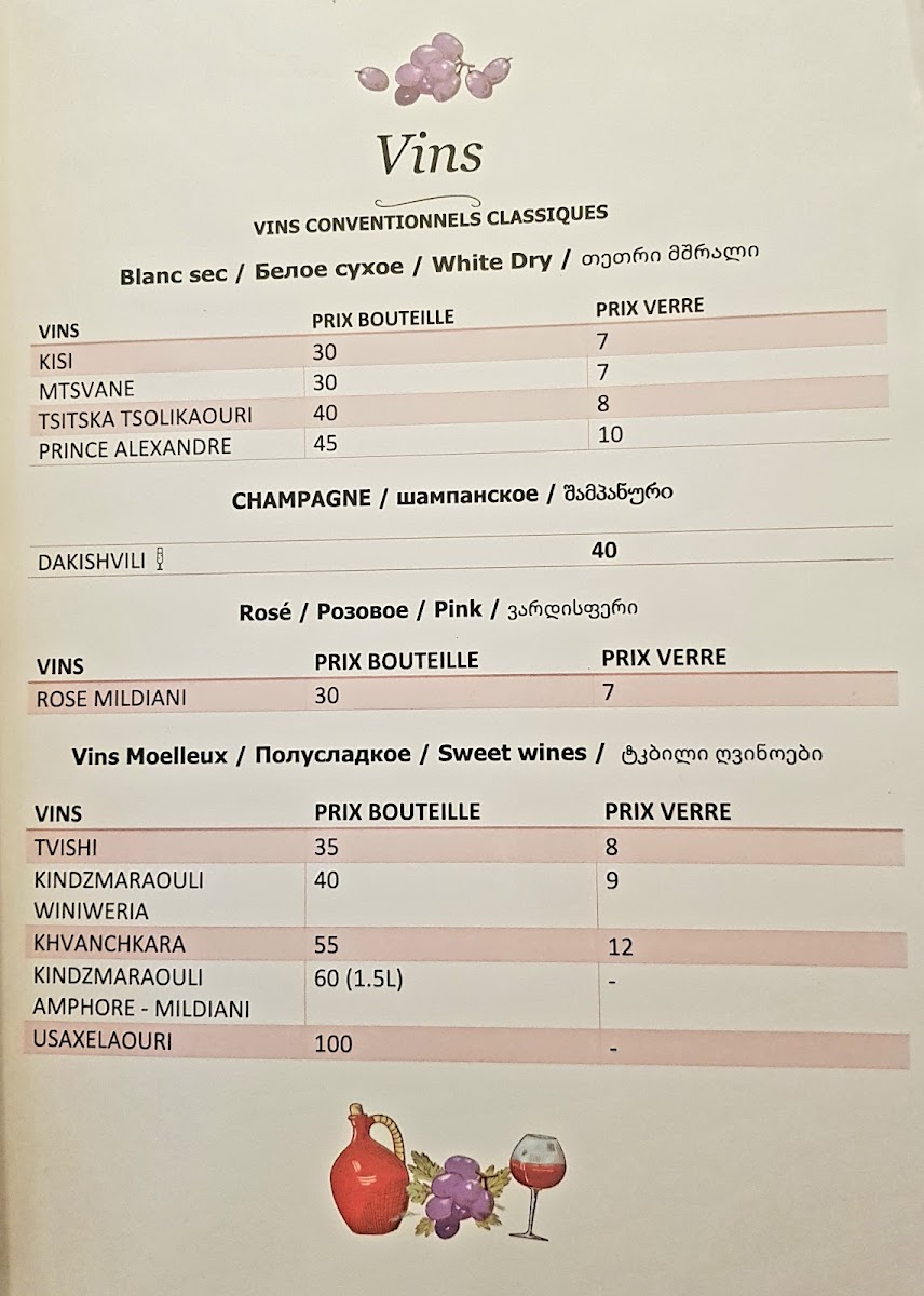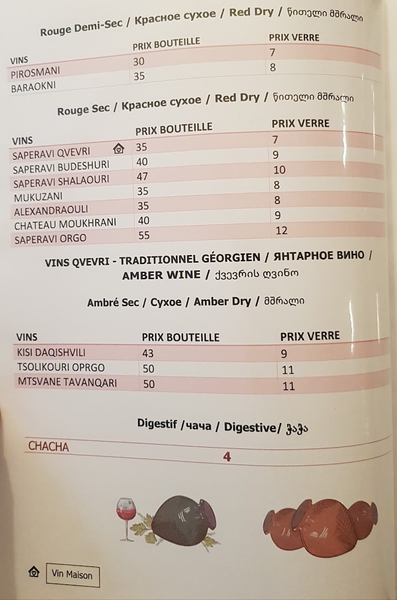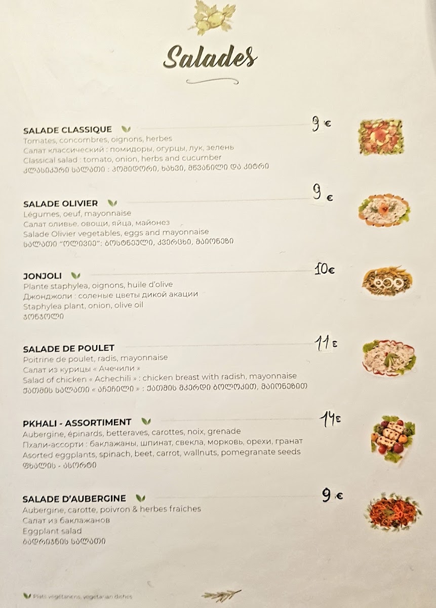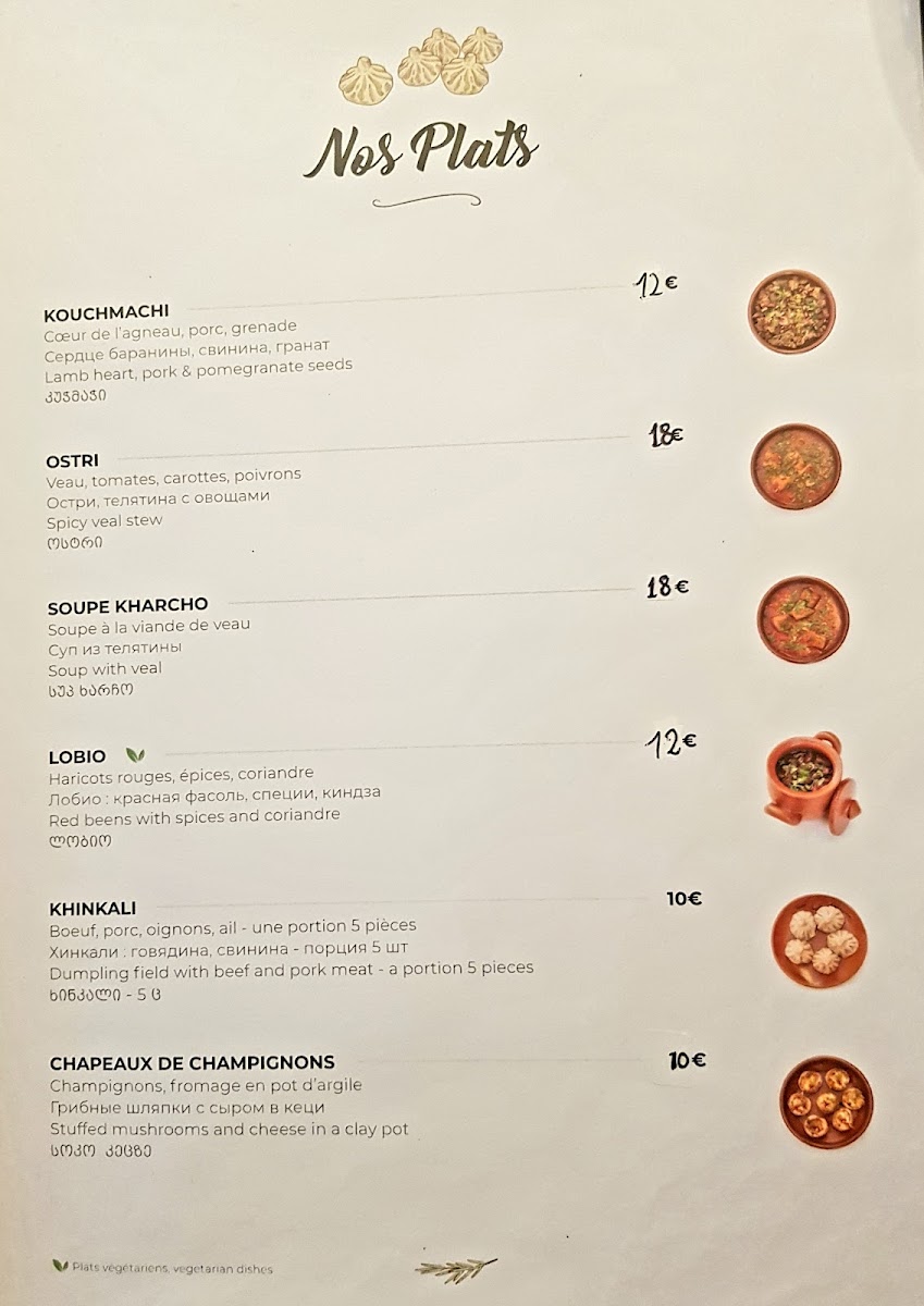 The menu at Restaurant Toné Géorgien offers a selection of traditional Georgian dishes alongside a variety of complementary beverages. The food options include a range of starters, mains, and desserts showcasing characteristic ingredients and cooking styles from Georgian cuisine. Visitors can expect dishes such as Pkhali (vegetable and walnut spreads), Khachapuri (cheese-filled bread), and various meat dishes including Shashlik (grilled pork skewers) and Veal prepared with tomato. Vegetable salads and side dishes like eggplant salad are also available.